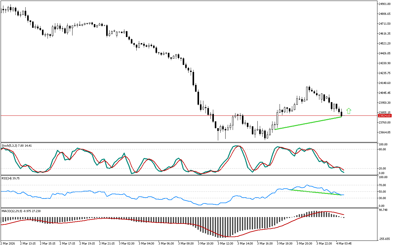 Између графикона цена и индикатора RSI формира се класична дивергенција, означена зеленом линијом. Цена DAX 40 је ажурирао локални минимум,…
