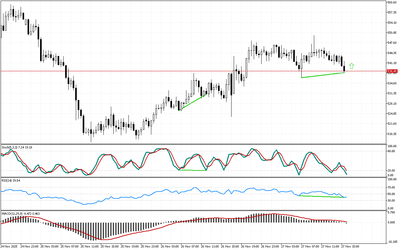 Осцилатор RSI идентификује неслагање. Цена није успела да достигне нови врхунац, док је RSI индикатор порастао изнад претходног максимума, што указује на потенцијални преокрет кретања цена.