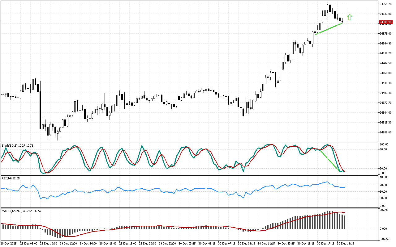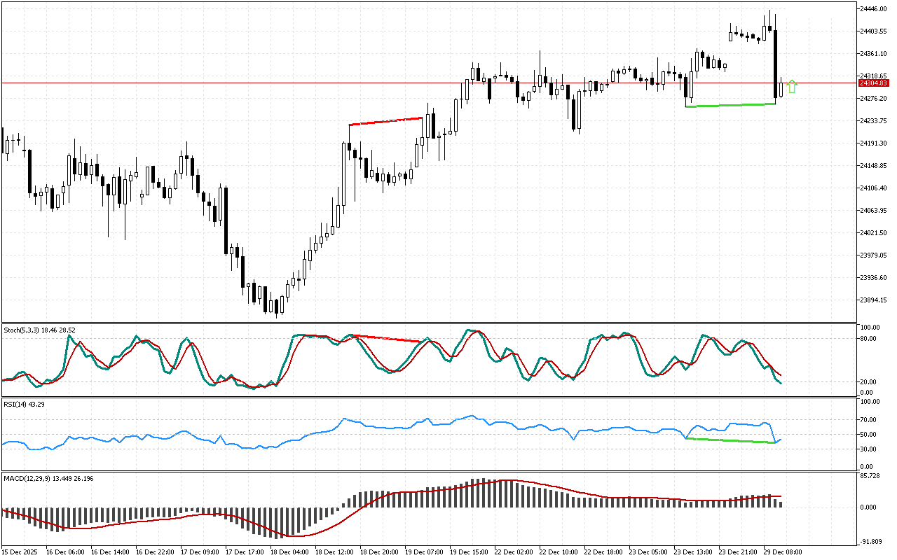 DAX 40 одржава узлазни смер кретања, док Stochastic пао испод 20. Добијена обрнута дивергенција је означена зеленом линијом на графикону.RSI…