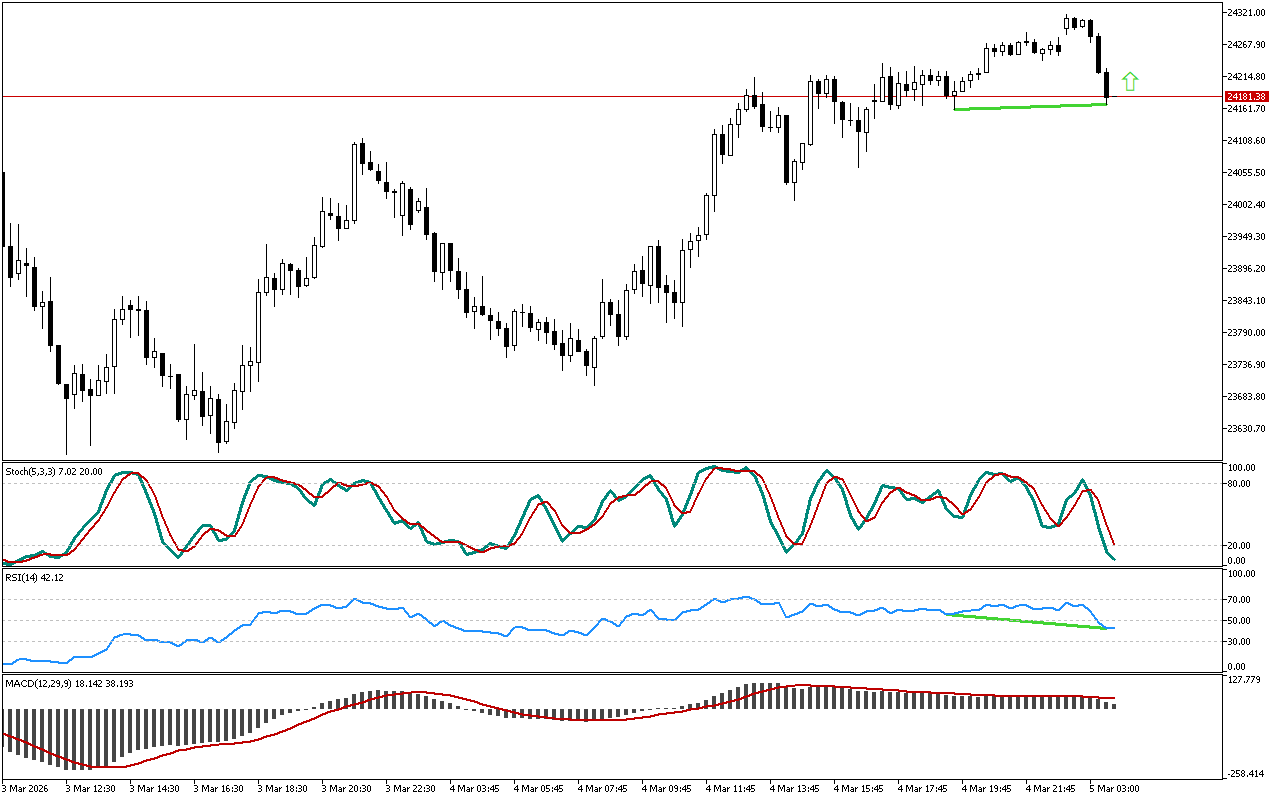 Између графикона цена и индикатора RSI формира се класична дивергенција, означена зеленом линијом. Цена DAX 40 је ажурирао локални минимум, док је индикатор држи изнад 30 ознака.